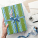 Ce modèle de papier d'emballage présente un motif à rayures vert et bleu ciel clair. Un papier comme celui-ci peut être utilisé pour préparer des cadeaux qui sont donnés pour célébrer un anniversaire, un mariage, un anniversaire ou un autre événement.