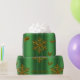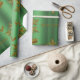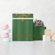 Ce papier d'emballage de Noël présente un design vert et or, avec un motif de décorations de Noël en or métallique frappant sur un arrière - plan dégradé vert. Il y a de grands flocons d'or, des feuilles sacrés dorés, un petit Père Noël d'or et son traîneau tiré par des rennes, et un accueil très festif de "Joyeux Noël".
