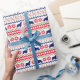 The repeated pattern on this colorful Christmas Nordic sweater style gift wrapping paper is a silhouette American Cocker Spaniel dog among snowflakes , trees, and geometric designs. Colors include navy blue, bright Holiday green, and red, all on a white background.