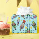 A cute and colorful pattern of nutcrackers, mistletoes, and bells with a baby blue background.
