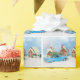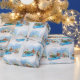 Antique aqua car with Christmas tree on the rooftop with gingerbread houses in snow