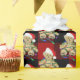 Ours en peluche Brown enchevêtré dans les lumières de Noël sur arrière - plan de buffle rouge et noir.
