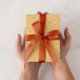 Senzillo y elegante paper de regalos con puntos negros y rojos sobre fondo amarillo anaranjado.