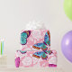 Motif sans couture avec papillons colorés et roses sur un arrière - plan rose, illustration vectorielle. Les papillons sont roses, bleus et turquoise. Les roses sont blancs. Le style est caricatural.
