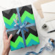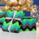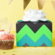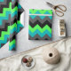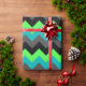 Un rouleau de papier d'emballage avec un élégant design motif de chevrons multicolores en noir, gris, vert et turquoise.