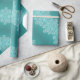 A Digitalbcon Images Design avec une couleur bleu turquoise et un design Damask avec une variété d'images, de formes, de motifs, de styles et de polices dans ce papier d'enveloppement "Damask Turquoise Mariage" unique en son genre. Ce design élégant et attrayant est livré avec des lettres de texte personnalisées pour convenir à votre propre salutation. Cette conception spéciale correspond aux modèles de cartes de Faire-part de mariage disponibles dans les différentes tailles ainsi que les étiquettes de cartes RSVP et d'adresse de retour, Magnets, boutons, cartes de note de remerciement et Classeurs.