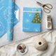Elégant et mignon papier d'emballage de Noël personnalisé avec Père Noël dans son traîneau tiré par une licorne avec parties scintillant dorée et rouge dans sa crinière et sa queue, divers flocons de neige, et des arbres de Noël décorés de billes d'argent. Parfait pour les petits enfants, surtout les petites filles qui aiment les licornes. Avec l'accueil "Joyeux Noël / Emma !" en écriture cursive / calligraphie. Assurez-vous de personnaliser le nom. Sur un arrière - plan bleu.