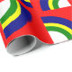 Ce papier d'emballage a une conception Bauhaus de quarts de cercles en bleu, jaune, vert et blanc sur un champ de rouge.
