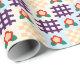 A seamless grid pattern combining stylized flowers, checker textures, and bold hash-like shapes in soft cream, blue, red, green, and purple tones.