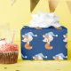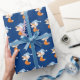 Cet adorable emballage cadeau de Noël présente un arrière - plan bleu avec un motif mignon d'un renard qui porte un chapeau bleu santa et un ruban bleu. C'est le papier d'emballage parfait pour Noël pour les enfants.