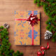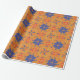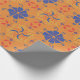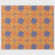 Orange wrapping paper featuring a repeating pattern of blue flowers, red hearts, and colorful swirls displayed both unrolled and flat.