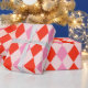 A bright, modern retro hand drawn diamond patterned holiday wrapping paper in shades of pink and red.