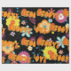 Un design floral coloré avec le mot Super. Une gamme colorée de fleurs — la puissance des fleurs — en bleu vif jaune et rose sur un arrière - plan noir.