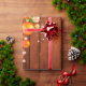 Papier d'emballage rustique de Noël avec un arrière - plan en bois foncé et des décorations de Noël brillantes.