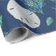 Dollars de sable et papier d'emballage de corail marin sur un rouleau. Des dollars réalistes de trou-clé blanc font un motif avec du corail bleu-vert et des coquillages sur un arrière - plan bleu marine foncé. Parfait pour fêter un anniversaire d'adulte ou envelopper des cadeaux de mariage.