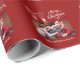Un arrière - plan rouge, un texte blanc et un arc rouge. Texte et photo. Joyeux Noël est écrit avec une élégante police de style manuscrite.