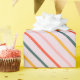 The paper features a large-scale, mid-century modern geometric pattern consisting of diagonal stripes. The design uses a coordinated mix of muted coral, sunny mustard yellow, and sage green set against a soft lavender or pale pink background. Perfect for birthdays, holidays, or everyday gifting, this design adds a joyful pop of color to any present—no extra embellishments needed.