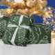 Des mitaines, foulards, chaussettes et chandails dessinés à la main et posés en blanc contre un arrière - plan vert. Enveloppe cadeau de Noël cosy et festif!