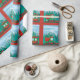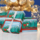 Papier d'enveloppement de train de Noël en rouge, vert et bleu ciel.