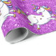 Un papier d'emballage unicorne violet brillant et coloré avec un motif de petites licornes mignonnes avec cheveux de couleur arc-en-ciel, crinière et queue, étoiles d'or sur leur corps et des sabots d'or. Ils dansent sur un arrière - plan violet scintillant de parties scintillant pétillante. Cette enveloppe de licorne violette serait idéale pour un cadeau d'anniversaire pour enfants, pour l'artisanat de licorne, et plus encore.