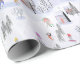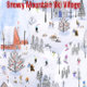 Un papier d'emballage de vacances animé présentant un village de ski de montagne avec des chalets, des skieurs, des visiteurs, des commerçants, des chiens et des canards, tous magnifiquement détaillés dans un motif répétitif sans couture. Artiste : Bibela