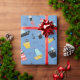 Papier à envelopper avec un joli motif avec voiliers et navires en caricature jaune et noir, de mignons sous-marins, un marin à la barbe noire, un pantalon rouge et une pipe, un phare rouge et blanc, et une ancre noire sur un arrière - plan bleu clair décoré de petites bulles et des vagues.