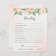 Cette carte de jeu pour baby shower présente de belles roses et pivoines à l'aquarelle pastel dans des nuances de rose blush et de pêche avec des feuilles botaniques vertes luxuriantes et de l'eucalyptus.