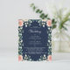 Budget Modern Navy Blue Floral Mariage Flyer - présente des roses chic beige et rose vif et poussiéreux avec cadre verdoyant sur l'arrière - plan bleu marine tendance. L'envers de l'invitation de la nuptiale est bleu marine avec des fleurs rose et beige pastel.