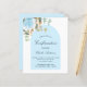 Un arrière - plan blanc décoré d'une végétation d'eucalyptus, un rose bleu clair, des feuilles dorés et un cadre en arc de cercle bleu. Personnalisez et un nom et des détails de la cérémonie. Élégant script de style écrit à la main. Dos : arrière - plan bleu clair.
