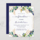 A l'avant : Un arrière - plan blanc décoré de verdure d'eucalyptus et de feuilles dorés et de parties scintillant en faux or scintillent. Une croix d'or. Personnalisez et le nom de l'enfant et les détails de la cérémonie. Texte bleu. Retour : arrière - plan bleu marine.