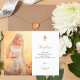 Un carte de remerciements de confirmation moderne et élégant pour elle et lui. Un arrière - plan blanc chic décoré d'une croix d'or. Personnalisez et ajoutez votre photo, merci note et nom.