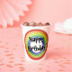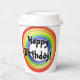 Konzentrische, dreidimensionale Kreise, in lila, blau, grün, gelb, orange und rot, werden auf zwei Seiten des Bechers dupliziert. Im Mittelpunkt der beiden Sets steht der Text "Happy Birthday!". Schwarzer Text hat einen weißen Hintergrundschatten.