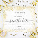 Un moderne et élégant Save the Date pour un mariage. Un arrière - plan blanc décoré de parties scintillant faux or. brille. Personnalisez et ajoutez une date et des noms. Le texte : Save the Date est écrit avec un grand script de style à la main tendance.