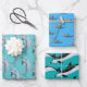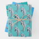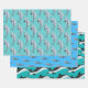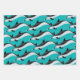 Papier d'emballage dauphin, en trois modèles et couleurs, imprimé sur trois grandes feuilles qui sont livrées roulées et non pliées. Les couleurs bleu mer, turquoise et vert lagon présentent différents types de dauphins nageant. Les modèles sont parfaits pour toute célébration d'anniversaire ou pour offrir un cadeau lors d'une fête estivale.