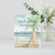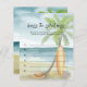 Bébé à bord ! Invitation pour une baby shower - parfait pour une baby shower d'été. Thème plage. Le design aquarelle présente un océan et une scène de plage avec planche de surf, palmier et chapeau d'été.