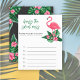 Baby shower invitation design avec flamingo rose avec frondes de feuilles de palmier vert luxuriant et fleurs d'hibiscus tropical. "Aloha Baby". Un motif à fleurs tropicales aux couleurs arrière - plans noires habille le dos de la carte.