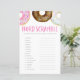Ajoutez cette amusante carte de jeu de mots pour bébé scramble à votre baby shower. Cette carte de jeu de baby shower propose des beignets rose, blanc et chocolat avec des arroses colorées. Personnalisez en ajoutant des noms, des événements et des dates. Ce jeu de baby shower de beignets d'aquarelle est parfait pour It's a Girl baby showers.