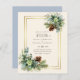 De beaux feuilles d'Eucalyptus et des cônes de pin d'hiver aux accents bleus poussiéreux sont présents sur cet automne, automne, articles de mariage d'hiver. Une partie d'une collection plus grande qui comprend des invitations à des mariages à prix réduit, des dates de remise, des RSVP, des remerciements aux cartes photos, des cadeaux de mariage et de mariage, et plus encore. Pour une planification de mariage d'hiver détaillée GRATUITE, consultez le guide weddingdesignchic.com.