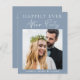 Mariage privé bleu poussiéreux et économique ou faire-part d'étage et accueil ou fête de fête. Le devant présente votre photo et "Happily Ever After Party" dans un mélange de typographie blanche simple et d'un script blanc moderne chic. Sous votre photo, ajoutez vos noms et date mariage. Au verso, personnalisez votre message et les détails de votre réception, entrez votre adresse de site Web mariage pour créer un code QR pour vos invités à scanner pour plus d'informations et à RSVP en ligne, et ajoutez vos noms dans un script blanc de type signature.