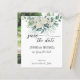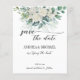 Budget vert eucalyptus blanc roses mariage enregistrer la date invitation modèle avec la photo de couple à l'arrière.