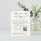 Élégant et économique, salon de crème légère ou petit faire-part mariage et réception de mariage ou invitation de fête. Le devant présente "Happily Ever After Party" en typographie simple et un script élégant avec des swashes. Customisez votre faire-part et votre invitation plus en détail, créez un code QR lié à votre site Web mariage pour que vos invités puissent scanner pour plus d'informations et à RSVP en ligne, et ajoutez vos noms dans un script de type signature. Au verso, vous trouverez votre photo de mariage préférée, vos prénoms et votre date de mariage.