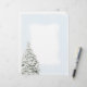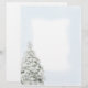 En-tête de lettre de vacances avec arbre à feuillage persistant enneigé et bordure bleue.