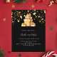 Une invitation pour une fête de Noël. Un fond noir. Décoré d'étoiles dorées et d'une pile de cadeaux. Personnalisez et ajoutez les détails. Texte blanc.