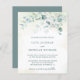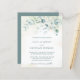 Elégant faire-part de mariage économique avec feuilles d'eucalyptus et verdure, ainsi que les détails de votre événement sur un lavage pastel aquarelle. L'arrière est assortie d'une teinte de bleu doux et vert. Ce design simple et rustique est idéal pour un mariage à thème botanique en été. Ces invitations de mariage bon marché sont imprimées sur des feuilles de papier pour une option économique.