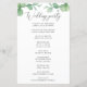 Create a polished ceremony experience with this double-sided wedding program featuring soft watercolor eucalyptus greenery across the top for a fresh, modern botanical look. Front side: a warm Welcome header with a clean order of ceremony layout (processional, readings, vows, rings, unity candle, recessional, and more). Back side: a dedicated Wedding Party section to list parents, officiant, maid of honor, bridesmaids, best man, groomsmen, flower girl, ring bearer, and any special roles. This design pairs elegant script with classic typography. Perfect for greenery, outdoor, garden, botanical, and modern classic weddings.
