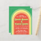 Faire-part de mariage rétro avec arc en ciel et fontes funky avec effet de texte d'ombre pour les noms de la mariée et du marié. Elle est colorée, verte, orange et jaune.