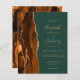 Le bord gauche de cette élégante faire-part de mariage moderne est doté d'une bordure en aquarelle aux teintes d'orange brûlé et de rouille, bordée d'une parties scintillant en faux or. Le texte personnalisable combine écriture manuscrite couleur or, cuivre et polices italiques sur un arrière - plan vert foncé. L'envers est assorti d'un design d'agate orange, rouille et or brûlé.