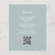 Ce faire-part de mariage moderne et simple présente du texte blanc sur un arrière - plan vert de verre de mer. Ajoutez les noms de la mariée et du marié en calligraphie stylisée et les détails en police sans serif. L'envers offre de l'espace pour les détails mariages sur un arrière - plan vert de verre de mer solide, ainsi qu'un code QR que les clients peuvent scanner pour visiter votre site Web et RSVP, qui économise le coût d'impression et d'envoi de cartes RSVP séparées.
