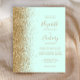 Le bord gauche de cette élégante faire-part de mariage moderne est orné d'une bordure de parties scintillant en faux or. Le texte personnalisable associe écriture manuscrite dorée, cuivre et polices italiques sur un arrière - plan vert menthe pastel. L'envers est assorti d'une parties scintillant vert menthe et or.