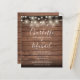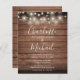 Un élégant faire-part de mariage à budget rustique avec de jolies lampes à cordes, des noms de style signature et une typographie chic sur un arrière - plan en bois rustique. Conçu par Thisisnotme©